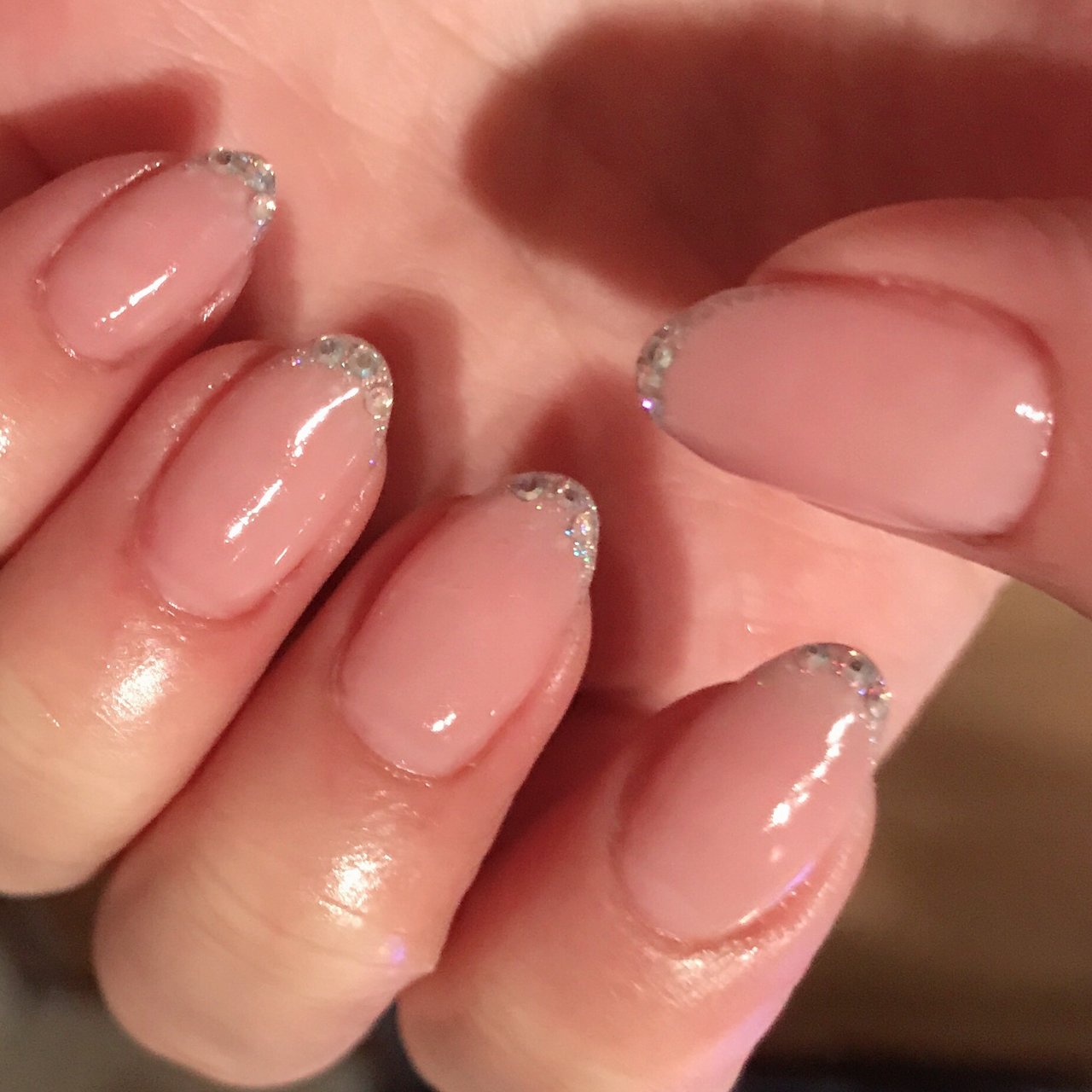 ヌーディーフレンチネイル ピンクベージュのヌーディーフレンチネイルにラメとストーンをのせた上品なフレンチネイルアートです ネイルアート ネイル サンプル紹介 ネイルナビビ Nail Navivi 東京